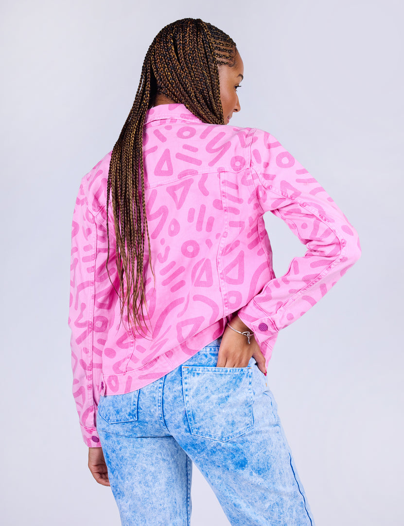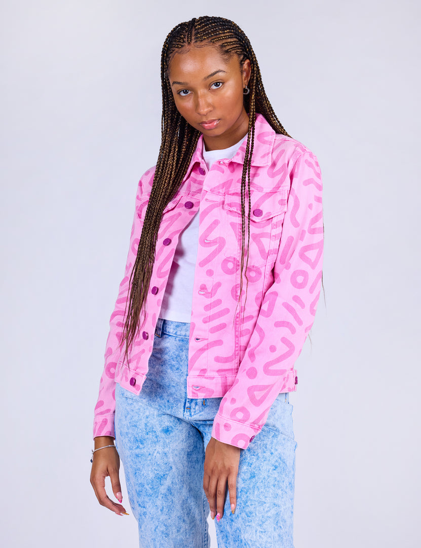 This tonal allover print jacket has classic denim construction with two chest pockets and two welt side pockets. Button it up with the custom molded squiggle tack buttons. Each jacket is individually cut, sewn, and garment dyed for a soft buttery finish.