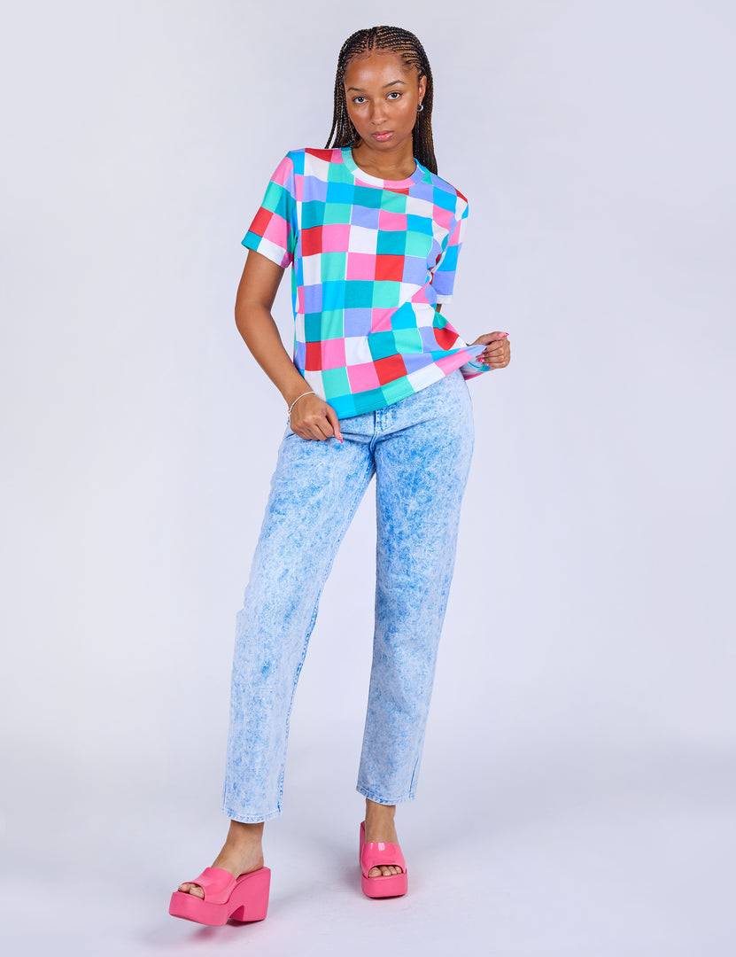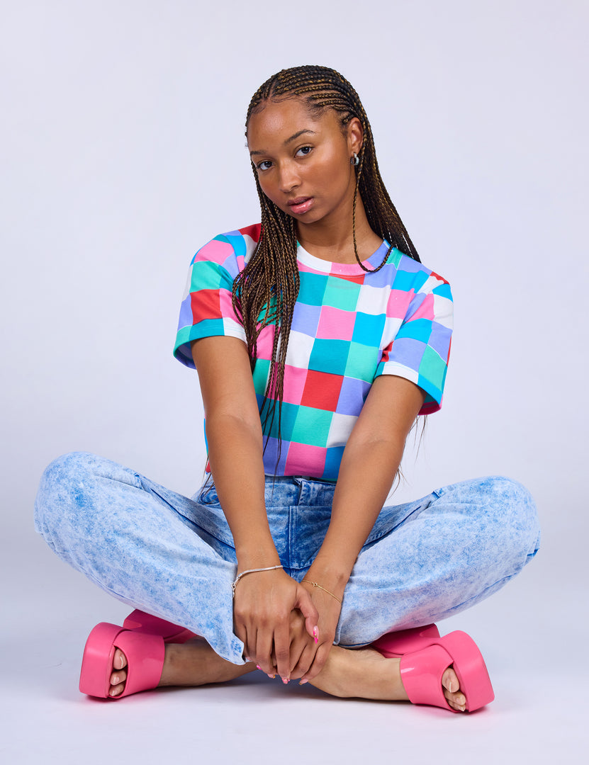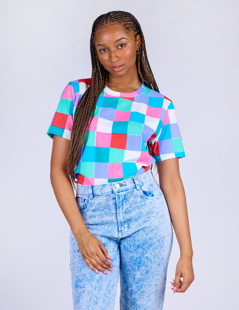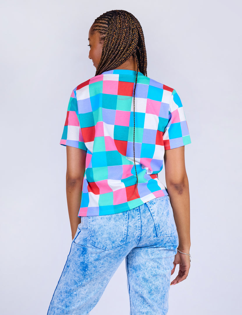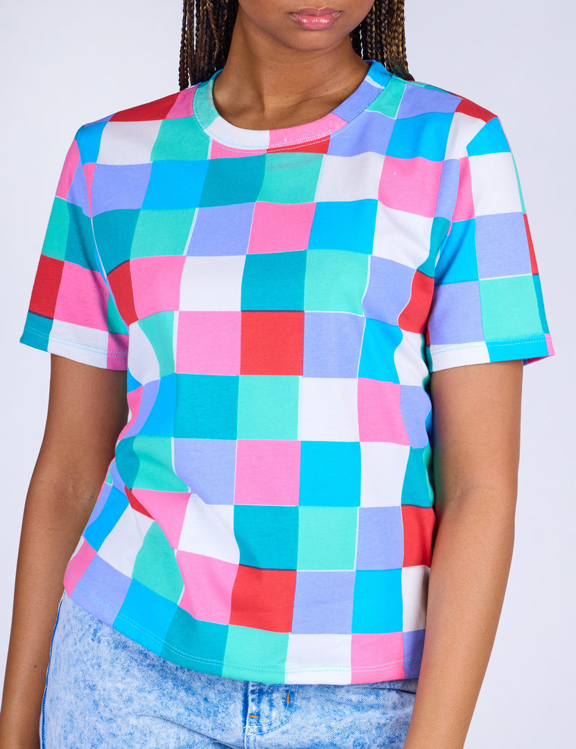 Heavyweight jersey cropped tee with an allover offset checker pattern screen print design.