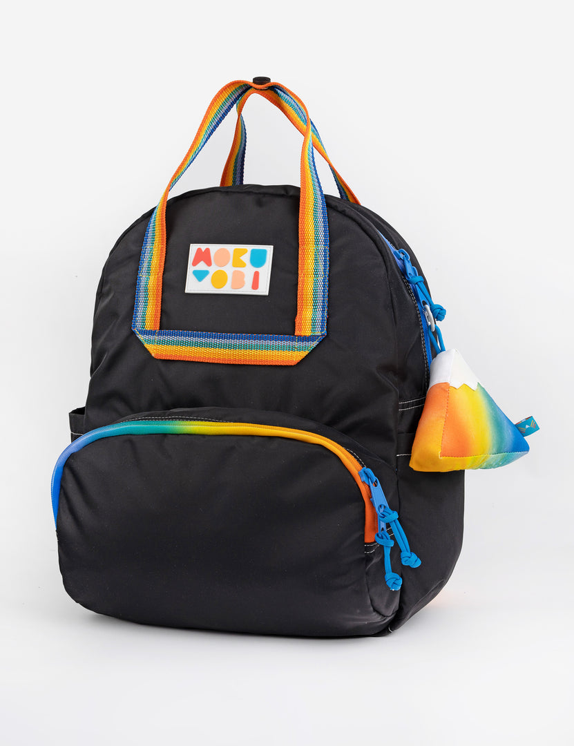 The ultimate go-to style. Mid-size backpack with a large wide-open front zipper pocket. 3D pockets on both sides to stash your umbrella or water bottle. Webbing tote handles featuring easy grab front and back strap with matching logo snap. Inside zipper pocket and back suitcase trolley sleeve for easy travel. Adjustable padded back straps with no fail construction. Zippered main compartment with pattern paracord pulls. Inside padded sleeve fits up to 15" laptop. Rubber logo label with embossed design. Rainbow airbrushed mountain plush keychain included!